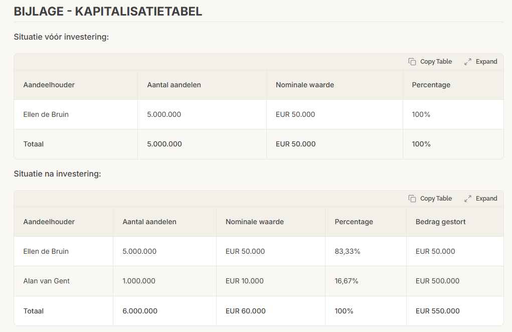 - Bijlage met kapitalisatietabel (voor en na investering)