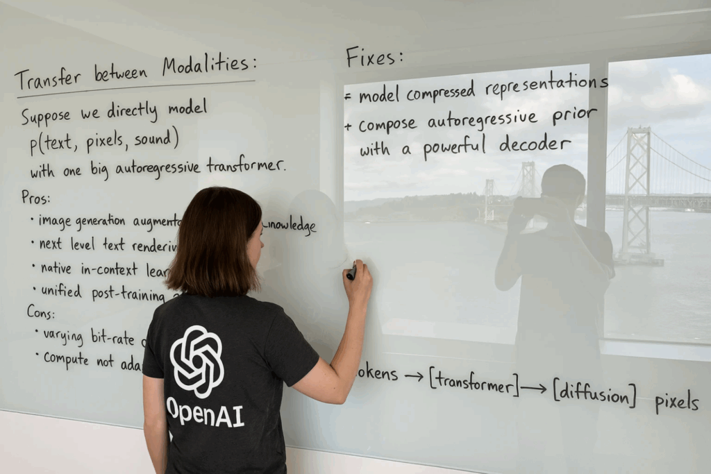 Prompt: A wide image taken with a phone of a glass whiteboard, in a room overlooking the Bay Bridge. The field of view shows a woman writing, sporting a tshirt wiith a large OpenAI logo. The handwriting looks natural and a bit messy, and we see the photographer’s reflection.